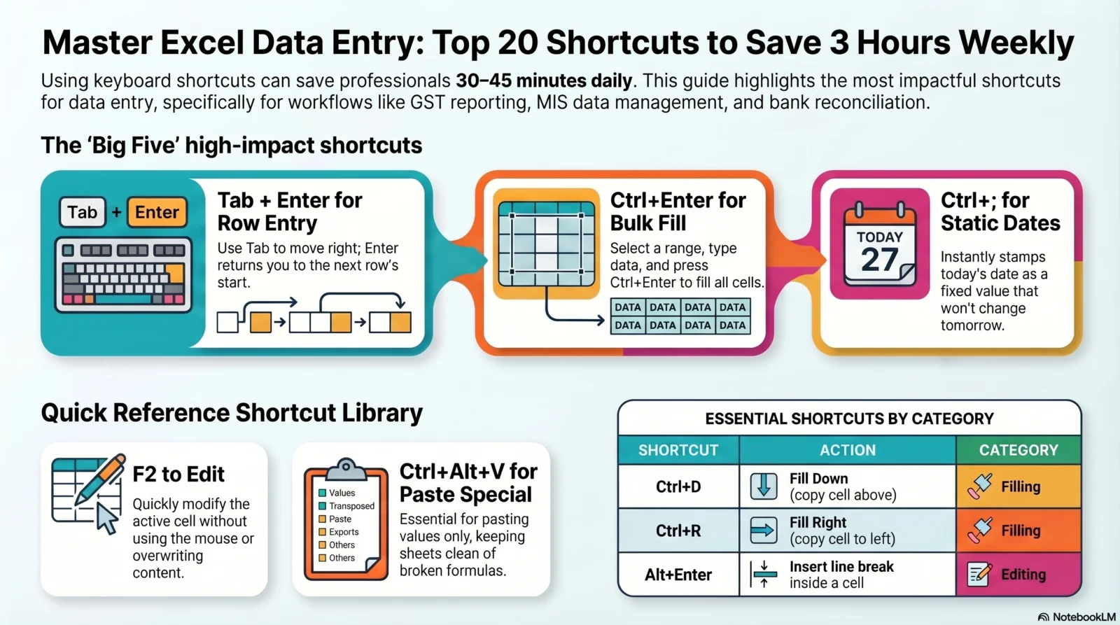 Here is the complete list of the 20 most useful Excel data entry shortcuts, grouped by category: